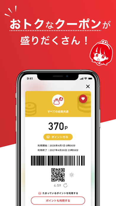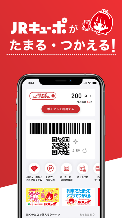 ■JRキューポアプリ加盟店で会員証(バーコード・QRコード)を提示するとポイントがたまる。 つかえる。