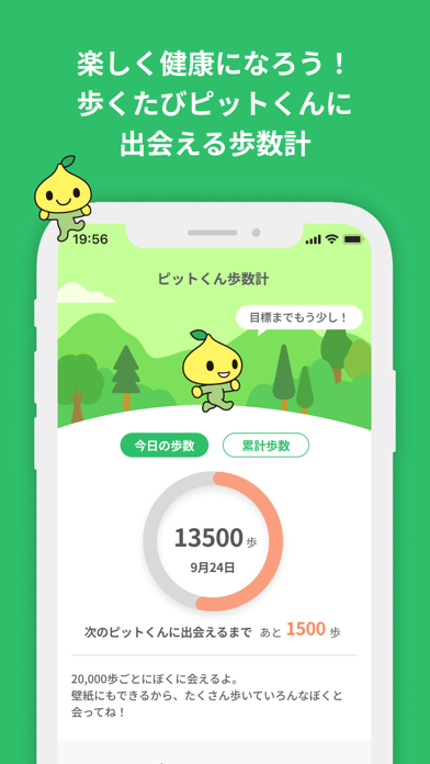 たくさん歩いて目標を達成すると、いろいろなピットくんの壁紙画像がもらえる歩数計機能がついています。