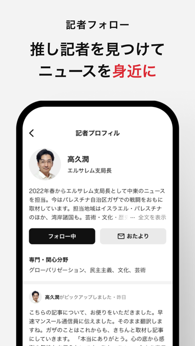 【記者フォロー】気になる記者の新着記事やつぶやきなどをタイムラインでチェックでき、ニュースを身近に感じられます。