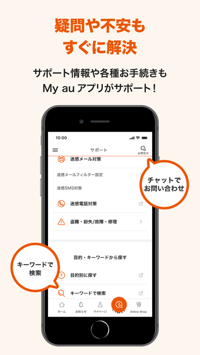 ・テキスト形式でオペレーターへの相談ができるメッセージ機能や来店予約手続きができます